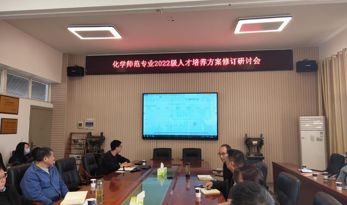 在14教西303会议室召开了化学师范专业2022级课程教学大纲及人才培养方案修订研讨会。会议由化学系主任舒文明老师主持,院长颜学敏、副院长吴爱斌以及各位骨干教师参加讨论。