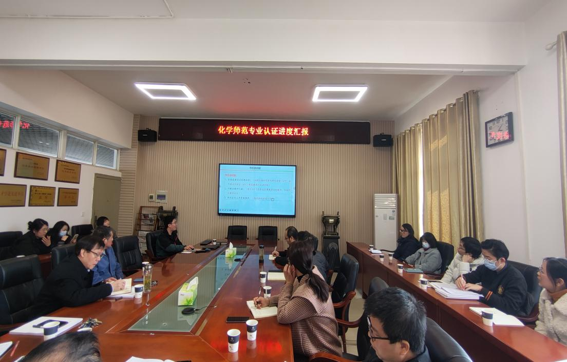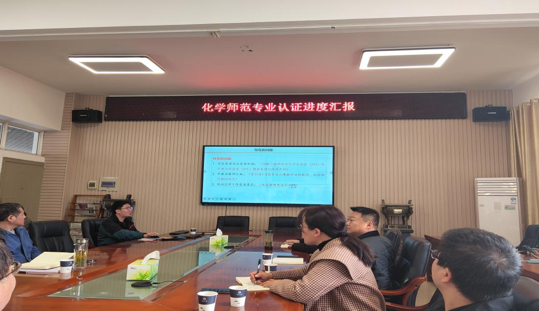 于14教西303会议室召开化学师范专业认证工作进展汇报。会议由化学系主任舒文明主持,颜学敏院长、吴爱斌副院长以及部分专任教师参加了此次会议。