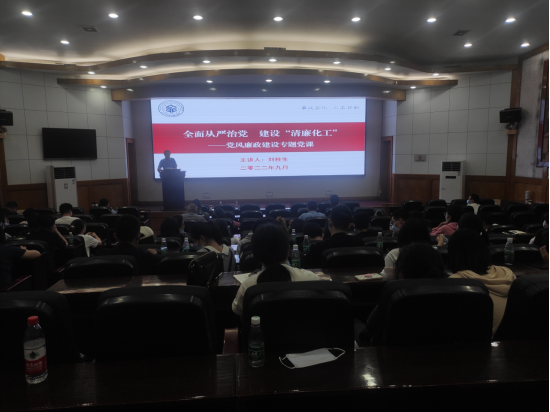随后,分党委书记刘桂生以《全面从严治党建设“清廉化工”》为题讲授廉政专题党课。课上,他以“5384”行动计划破题,系统地解读了“清廉长大”建设方案、党风廉政建设宣教月活动方案等,同时结合实际对深入贯彻落实党风廉政建设精神提出了具体要求:一方面学院要高度重视,着力担负起党风廉政建设主体责任,立足本院特色、聚焦主题、精心组织各类活动,努力营造宣传教育浓厚氛围,切实增强活动效果。全体师生党员干部要深刻认识廉政建设与学院改革发展的关系,严格落实党风廉政建设要求,讲党性、重品行,自警自省、严于律己,以实干担当推进学院各项事业稳健发展。