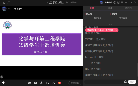 线上召开了19级学生干部培训会。参加本次会议的有18级优秀干部徐珊珊,吴丹妮以及19级全体学生干部,会议由辅导员王娜老师主持。
