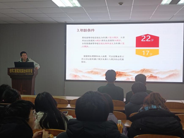 参军入伍学生管理办法》和高校学生服兵役的资助政策,就参军入伍的应征条件、各项优待政策、参军报名的流程和时间等内容进行详细介绍,号召符合条件的同学们积极报名参军入伍,投身军营,在祖国最需要的地方贡献自己的力量。