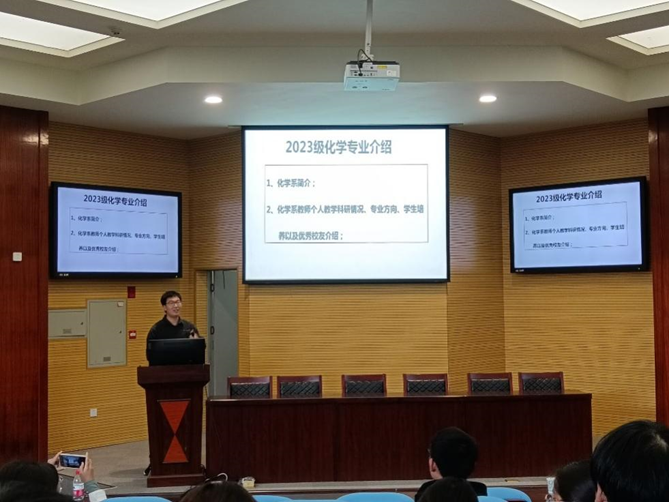 化学系主任舒文明老师结合专业特色,为同学们详细地介绍了化学(师范)专业师资力量、发展方向和专业特点等,还指出,我院化学(师范)专业已完成师范专业认证,这肯定了本专业的教学水平,也助力了同学们的未来就业。最后,舒文明老师对新生表达殷勤希望与嘱托,希望同学们认真做好专业选择和未来职业规划,祝愿同学们在长大度过充实且有意义的大学生活。