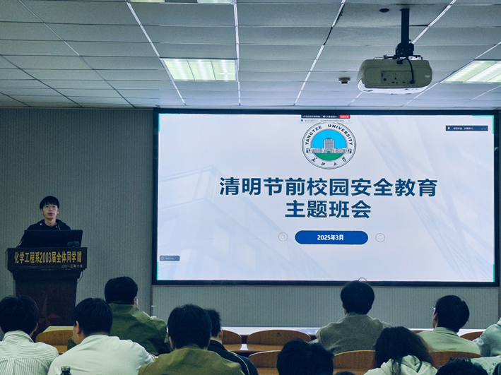 在14教北201会议室召开2025年研究生清明节假期安全班会。学院研究生辅导员王陈、兼职辅导员余海涛、全体研究生参会。
