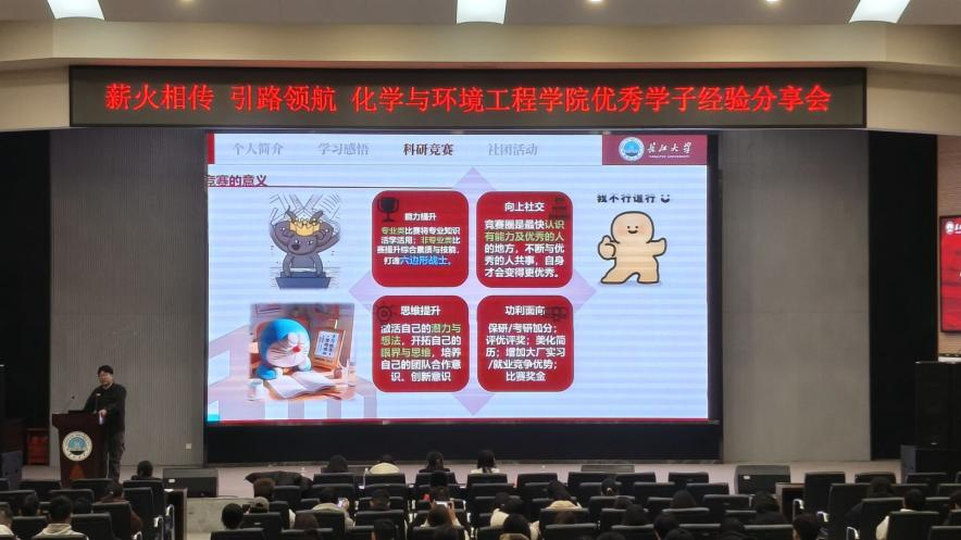 在科研与竞赛分享环节,学长学姐们详细介绍了大学生创新创业训练计划项目、全国大学生数学竞赛、化工实验技能大赛等一系列优质赛事资源与参与路径。他们建议新生提前关注学校官网及学院公告,深入了解专业老师的研究方向,结合自身兴趣主动通过邮件等方式与老师沟通,争取加入课题组、进入实验室的机会,尽早接触科研实践;同时鼓励大家打破学院壁垒,积极与外院学生交流合作、跨学科组队参赛,在思想碰撞中拓宽视野,提升团队整体竞争力。