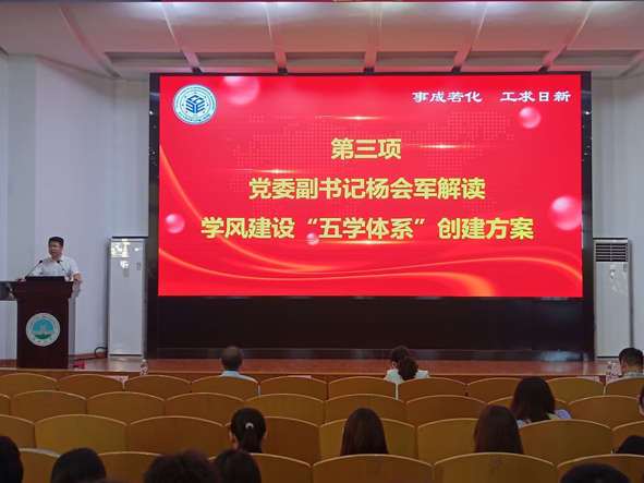 党委副书记杨会军为同学们解读了学院学风建设“五学体系”创建方案,他强调学风建设的重要性,要求同学们树立全面学习、终身学习的观念,明确学习目标,端正学习态度,增强学习动力,取得优异学习成果。希望学生干部发挥带头作用,一带十,互帮互助,形成人人热爱学习、人人督促学习、人人从中受益的生动局面。同时,就本科教育教学审核评估做了再动员,他要求同学们以主人翁的姿态迎接本科教育教学审核评估,积极配合学校做好各项工作。