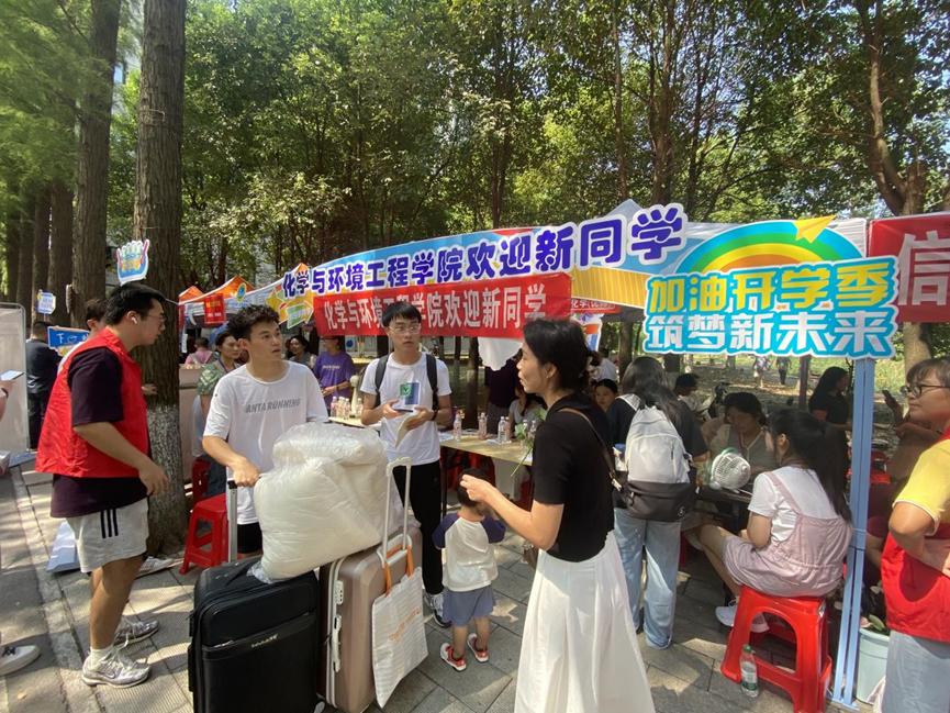 迎新现场,学院迎新志愿者指导新生在迎新处扫码报到,帮助新生搬运行李到宿舍楼。他们挥汗如雨,一丝不苟为新生提供全方位服务,发扬“奉献 有爱 互助 进步”的志愿者精神,展现了化工学子乐于助人的良好品质。