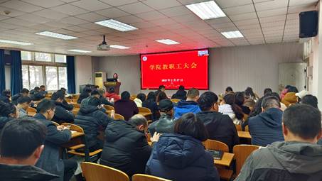 2025年春季学期第一次全体教职工大会在14教北201召开。学院全体教职工参加会议,党委书记王丽主持会议。