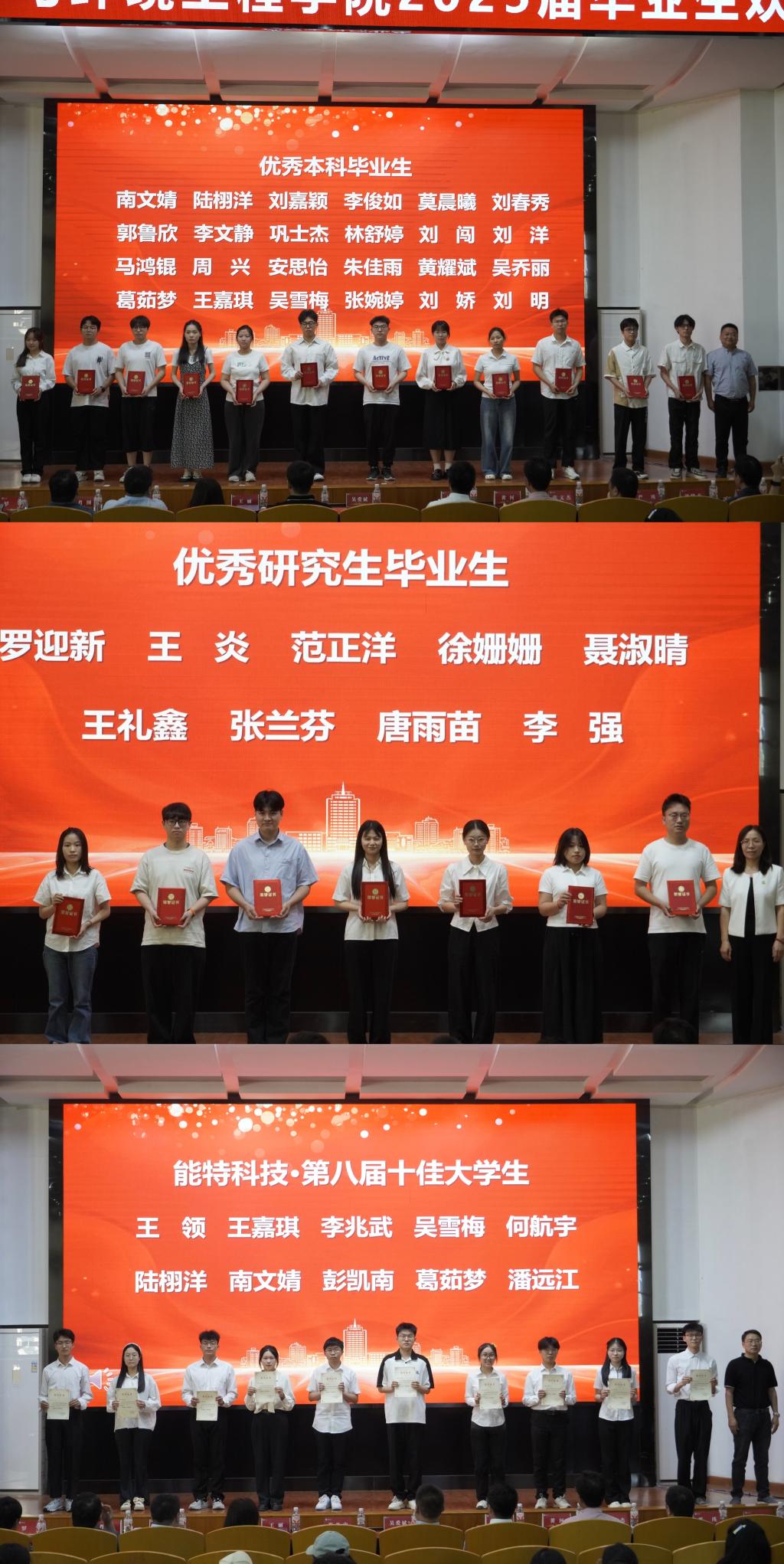 大会在热烈的氛围中拉开帷幕。主持人21级辅导员王娜以真挚的话语,向圆满完成学业的毕业生送上“毕业快乐”的美好祝福,现场掌声雷动。表彰环节中,学院对在学业、科研、实践等领域表现优异的个人与集体进行了表彰。2025届毕业生以笔为刃、以梦为马,共有136名本科生、8名研究生成功考入清华大学、南京大学等高等学府继续深造读硕读博,吴雪梅等21位同学作为考研优秀个人上台领奖;高材12102、化工12101等6个班级以及23栋A404等3个寝室,以卓越的团队协作精神脱颖而出,荣获考研先进班集体和考研优秀寝室荣誉称号;邓智豪、焦珂宣等19位学生,代表2025届57名优秀毕业生上台领奖,他们在校期间努力学习,全面发展,以青春之笔,书写了拼搏奋进的壮丽篇章;最后压轴登台的是荣获色情论坛