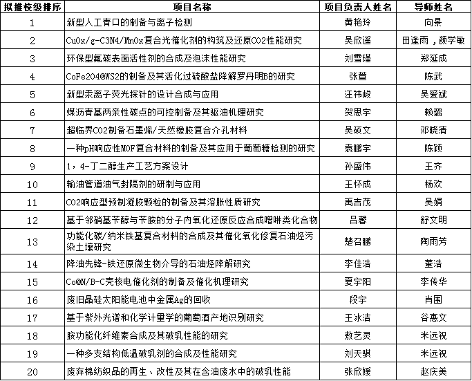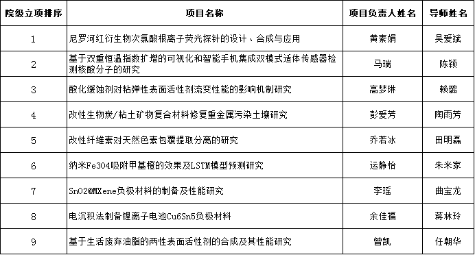 第十五批“大学生创新创业训练计划”项目申报的通知》要求,2022年10月6日学院组织专家对申报的30项创新训练类项目进行了评审。经过项目组学生的汇报答辩、专家评审,并结合项目申报通知要求,学院拟推荐《新型人工青口的制备与离子检测》等20项申报校级项目立项,拟立《尼罗河红衍生物次氯酸根离子荧光探针的设计、合成与应用》等9项为院级大创项目,其余1项不予立项,具体名单如下: