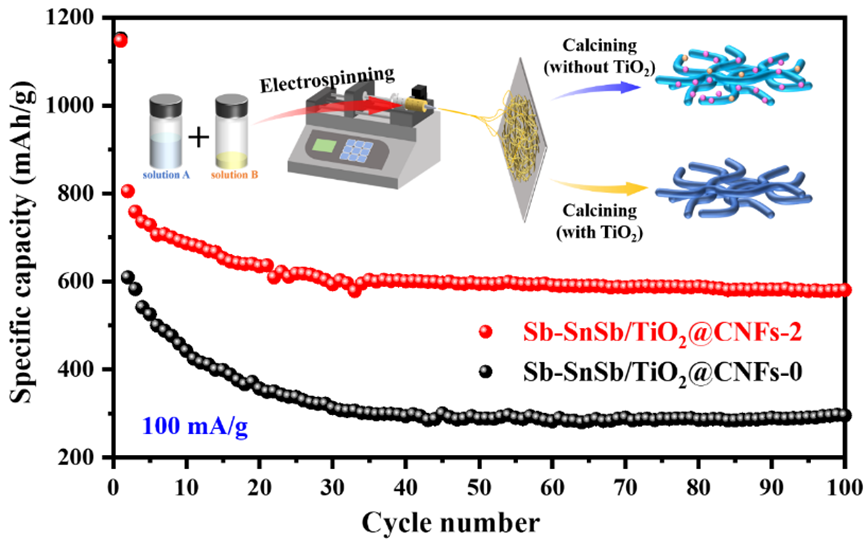 基于此,肖围教授课题组通过静电纺丝技术将SnSb合金、TiO2纳米颗粒均匀封装在导电互连的CNFs基体中,制备出Sb-SnSb/TiO2@CNFs复合负极材料。较高电子导电性的一维CNFs骨架有效地缓解了SnSb合金颗粒的体积膨胀效应,维持了材料的结构完整性。当TiO2用量被精准控制在2 mmol时,Sb-SnSb/TiO2@CNFs-2复合电极在100 mA/g下可提供1146.6 mAh/g的初始放电比容量,100次循环后其可逆放电比容量为580.4 mAh/g,此外,赝电容贡献优势明显,0.8 mV/s时赝电容贡献率为66.89%。该工作为静电纺丝法制备Sn/C纤维复合负极材料的实用性和进一步发展提供了新的参考、开辟了新的维度。