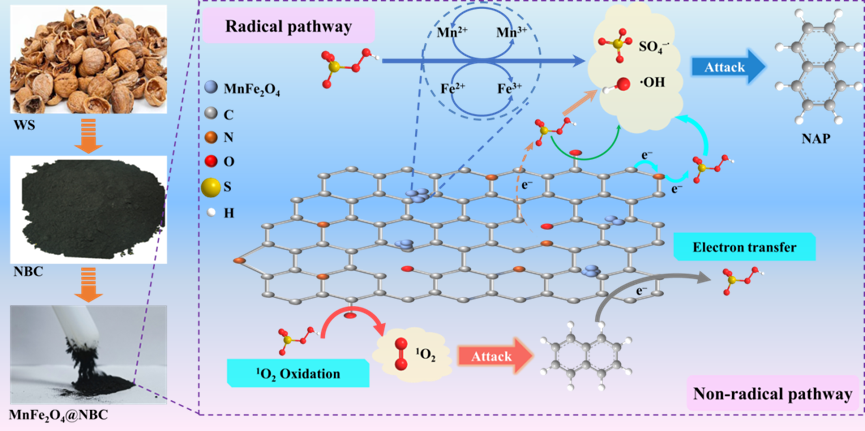 基于上述挑战,陈武教授课题组通过简单以核桃壳(WS)和尿素为生物质和氮源合成了氮掺杂生物炭(NBC),然后通过溶剂热法制备了催化剂MnFe2O4@NBC,研究了不同因素对其催化性能的影响,并采用多种技术对催化剂的组成、微观形貌和物理化学性质进行了表征。以NAP为模型污染物,研究了催化剂对PMS活化的反应性。评估了MnFe2O4@NBC/PMS体系对NAP去除效率的影响。还研究MnFe2O4@NBC/PMS体系的环境适应性。通过自由基猝灭实验、电子自旋共振实验和密度驱理论(DFT)计算,揭示了NAP降解和PMS活化的机理。提出了一个有效的MnFe2O4@NBC多相催化剂和PMS活化的新见解,扩展了生物炭基催化剂在环境修复中的潜在应用。