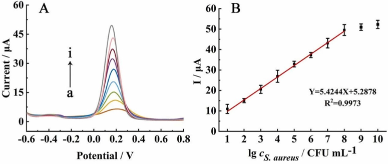 本研究通过将Apt组装在纳米金修饰的MOF表面制备具有靶标识别功能的纳米信号探针;通过电聚合和模板去除法在电极表面原位形成S. aureus细菌印迹层,作为捕获探针。当目标致病菌存在时,细菌印迹修饰电极捕获细菌,进一步与纳米信号探针结合形成夹心结构,继而固载大量亚甲基蓝(MB),通过与检测底液中的电活性[Fe(CN)6]3−/4−发生氧化还原循环反应以显著增强电化学响应信号。该方法由于将人工合成受体的双重识别及MOF调控下氧化还原循环放大相结合,展现出优异的分析性能,具有实际样品中细菌分析的巨大潜力。