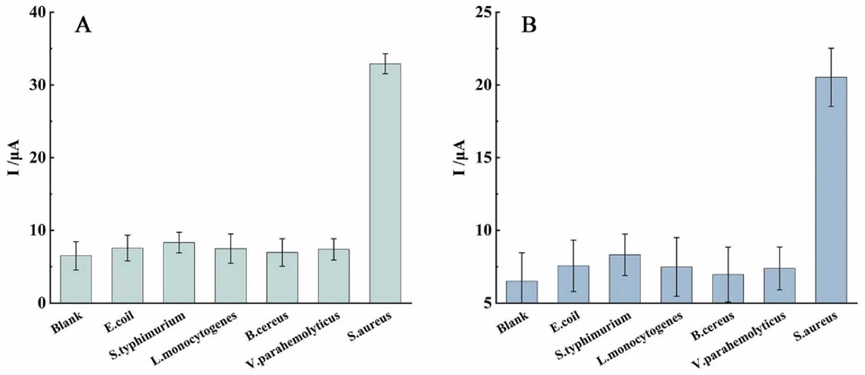 本研究构建了一种信号放大的夹心型电化学生物传感器,实现了S. aureus的快速、灵敏、选择性分析。该传感器将BIF选择性界面和MOF辅助氧化还原循环放大联用,具备低至1 CFU mL−1的检测限和良好的选择性,并可用于复杂样品检测。此外,通过替换不同的印迹模板和适体,本方法在检测其他细菌方面也展示出巨大潜力。总之,该方法具有出色的分析性能、高效快速操作及广泛适用性,在食品安全分析和细菌感染诊断领域具有广阔的应用前景。
