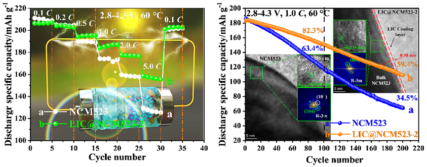 基于此,肖围教授课题组以LiCl与InCl3为原料、乙醇为溶剂,通过溶胶-凝胶法在LiNi0.5Co0.2Mn0.3O2(NCM523)正极材料表面均匀包覆Li3InCl6(LIC)快离子导体层。结果表明,该改性策略不仅减少了表面残锂量,而且降低了锂镍混排度。1.0 C,25 °C下循环200次后,2wt%LIC@NCM523-2复合正极的放电比容量仍有130.5 mAh g−1,容量保持率为76.8%。即使1.0 C,60 °C下循环200次后,放电比容量也有108.8 mAh g−1。5.0 C快速切换到0.1 C,该复合电极也能从128.2 mAh g-1轻易地恢复到164.3 mAh g-1。改进的电化学性能可归因于合适LIC层能保护活性颗粒免受电解液的腐蚀,不仅稳定了材料的内部结构,并促进Li+ 离子的传输。该改性策略为高性能正极材料的开发与利用提供了新的研究方向。