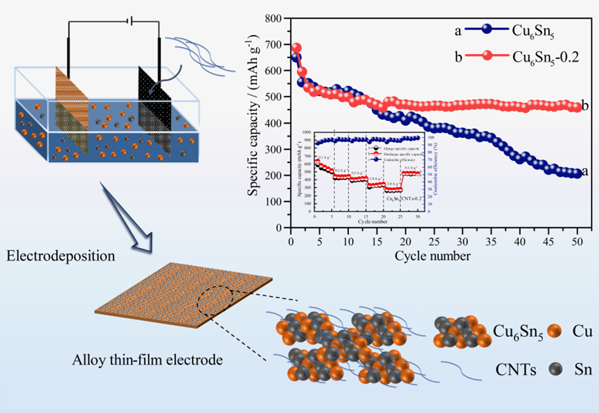 肖围教授课题组的最新研究成果。利用废弃印刷线路板Cu-Sn浸出液作为电沉积液,通过原位电沉积法成功制备了无粘结剂的铜锡合金/碳纳米管(Cu6Sn5/CNTs)合金薄膜电极,系统探究了电沉积液中碳纳米管(CNTs)的浓度对合金薄膜电极的影响。与传统电极制备工艺不同的是,此合金薄膜电极不需要额外添加导电剂和粘结剂便可牢固的附着在集流体铜箔上,可以进一步提升电池的体积能量密度,实现了废弃印刷线路板的资源化利用。