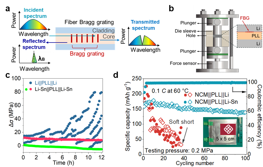 近日,色情论坛 李国成博士在材料科学领域取得重要研究进展,其成果" Decoding Chemo-Mechanical Failure Mechanisms of Solid-State Lithium Metal Battery Under Low Stack Pressure via Optical Fiber Sensors "发表于国际顶级学术期刊《Advanced Materials》(IF=27.4,Nature Index收录期刊,中科院一区TOP)。该研究创新性地采用布拉格光纤光栅(FBG)传感技术,首次实现全固态锂金属对称电池界面应力场分布的原位动态监测,成功解耦了低轴向压力工况下化学-机械多场耦合作用诱发的电池失效机制。此项工作开创了固态电池界面力学行为原位表征新范式,为高精度光学传感技术在新型储能器件失效分析中的工程化应用开辟了创新路径。李国成博士为论文第一作者,色情论坛 为论文通讯单位之一。 内容简述: 基于陶瓷-聚合物复合固态电解质的全固态锂金属电池展现出优异的储能应用前景,但其仍面临界面恶化与锂枝晶渗透等关键挑战,上述问题在低轴向压力工况下尤为严重。揭示其化学-机械耦合失效机理具有重大科学价值。本研究通过嵌入式光纤传感技术实时监测界面应力的演变与分布特征,阐明了其化学-力学耦合演化规律。研究发现,锂金属电极的不均匀溶出/沉积行为会引发界面应力的快速累积与空间异质性增长,进而加剧界面接触失效并诱发锂枝晶成核,引起电池短路失效。基于此,本工作构筑了三维锂/锂锡合金复合负极,发现该结构在低轴向压力条件下仍维持均匀的应力分布特征,实现了电化学性能的显著提升。本工作不仅构建了界面应力均匀性的原位定量表征方法体系,更为揭示全固态电池化学-力学失效机制提供了理论支撑,对高安全性固态电池体系开发具有指导意义。 该研究工作得到了香港理工大学深空探测研究项目(1-BBDC)、国家自然科学基金(52207230 和 92372109)、广州-香港联合基金项目(2023A03J0003 和2023A03J0103))等项目的支持。 图文摘要: 图(a)光纤光栅传感器工作原理示意图;(b)带有植入式光纤光栅传感器和外部压力传感器的改进型Swagelok电池示意图; (c)纯Li和Li-Sn固态对称电池前三次循环过程中的应力-时间曲线图;(d)固态软包电池的循环性能对比图。 文章链接://advanced.onlinelibrary.wiley.com/doi/full/10.1002/adma.202417770